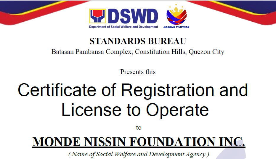 Monde Nissin Foundation, Inc. has received its Certificate of Registration and License to Operate from the Department of Social Welfare and Development (DSWD).